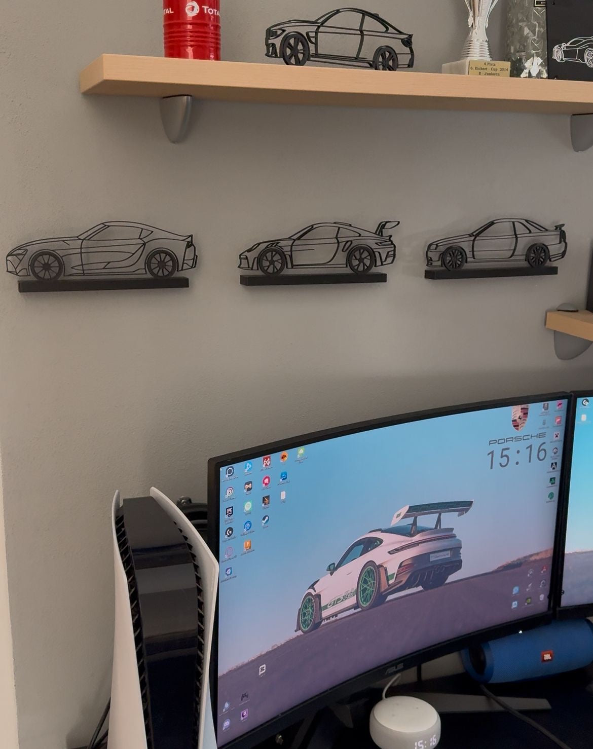 Der Nissan GTR34 ist ein echter Hingucker! Die Details sind sauber gearbeitet, und das Material wirkt hochwertig. Besonders praktisch ist die optionale Wandhalterung, mit der sich die Silhouetten einfach anbringen lassen. Eine tolle Deko-Idee für Auto-Fans!